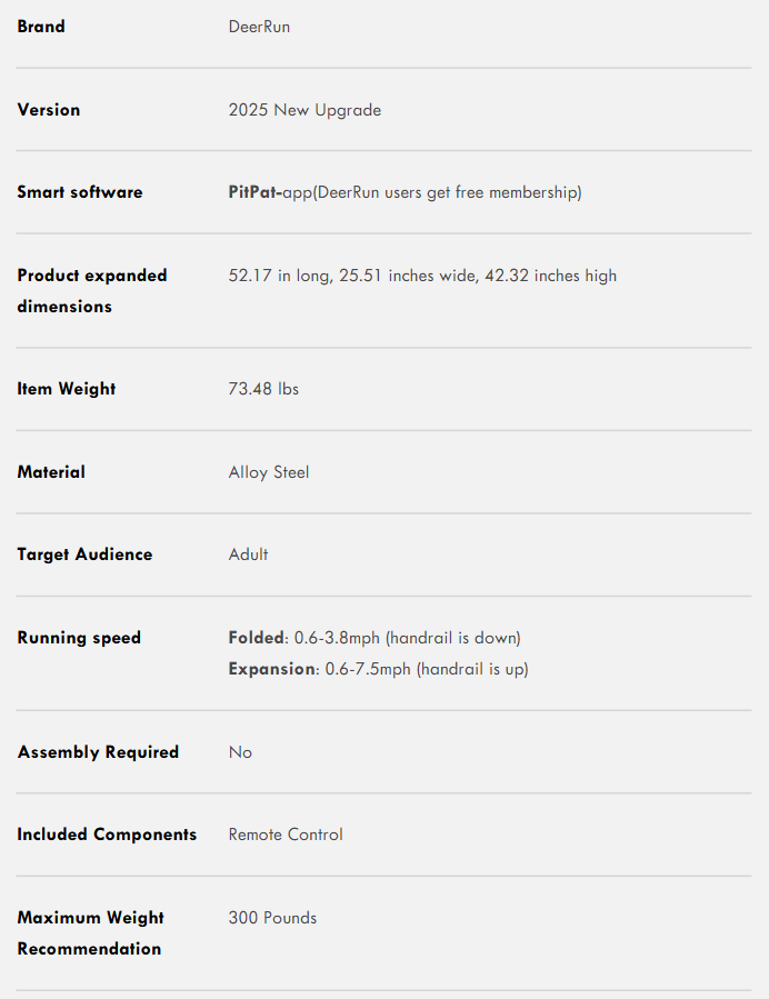 This state-of-the-art treadmill offers an unparalleled aerobic workout with its powerful motor and soft folding system, and the intelligent PitPat app lets you track your progress and have fun with running competitions. With modern design and intuitive controls, you'll have aunforgettable running experience with the DeerRun A5 Pro Smart!